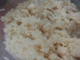 Tanak/masak pulut dengan air pandan dan garam(boleh tambah pewarna hijau jika ingin warna yang lebih terang). Jumlah air untuk memasak pulut kena sama dengan sukatan pulut - 1 cwn pulut/1 cwn air. Tambahkan sedikit garam.